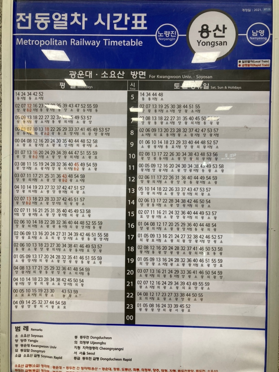 마지막으로 용산역에서 직접 찍어온 일반전철과 급행이 모두 표시된 시간대별 운행 시간표를 알아보겠습니다.